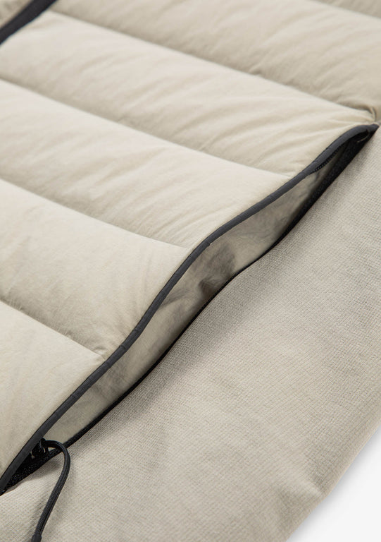 Утеплённая торсовая часть. Тонкий, мягкий на ощупь, эластичный нейлон. Обработан стойким водоотталкивающей пропиткой из экологичных ингредиентов без содержания PFC. 85 % нейлон, 15 % эластан. Утиный пух с максимальным содержанием пуха 90/10 усиливает теплозащитные качества куртки.