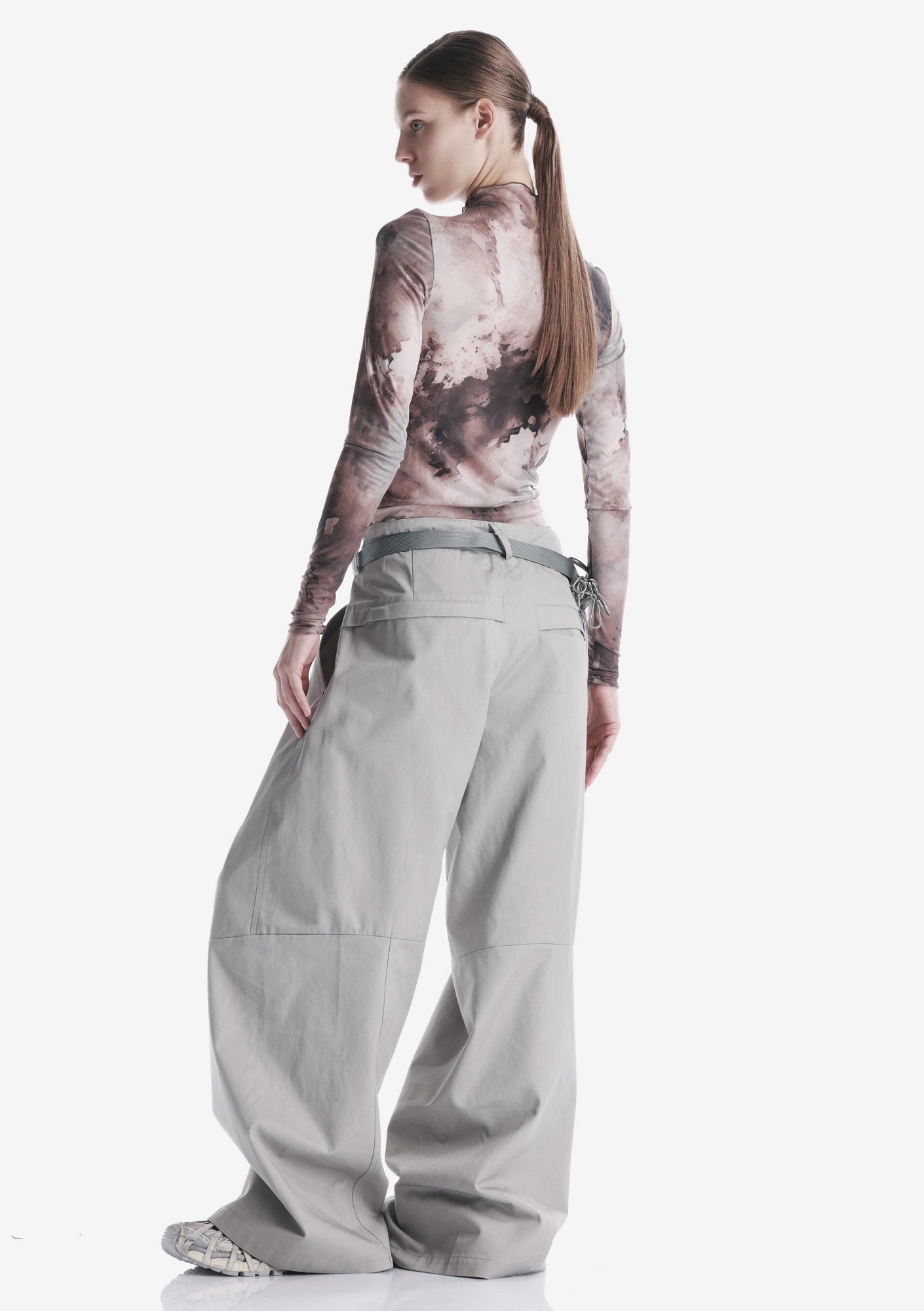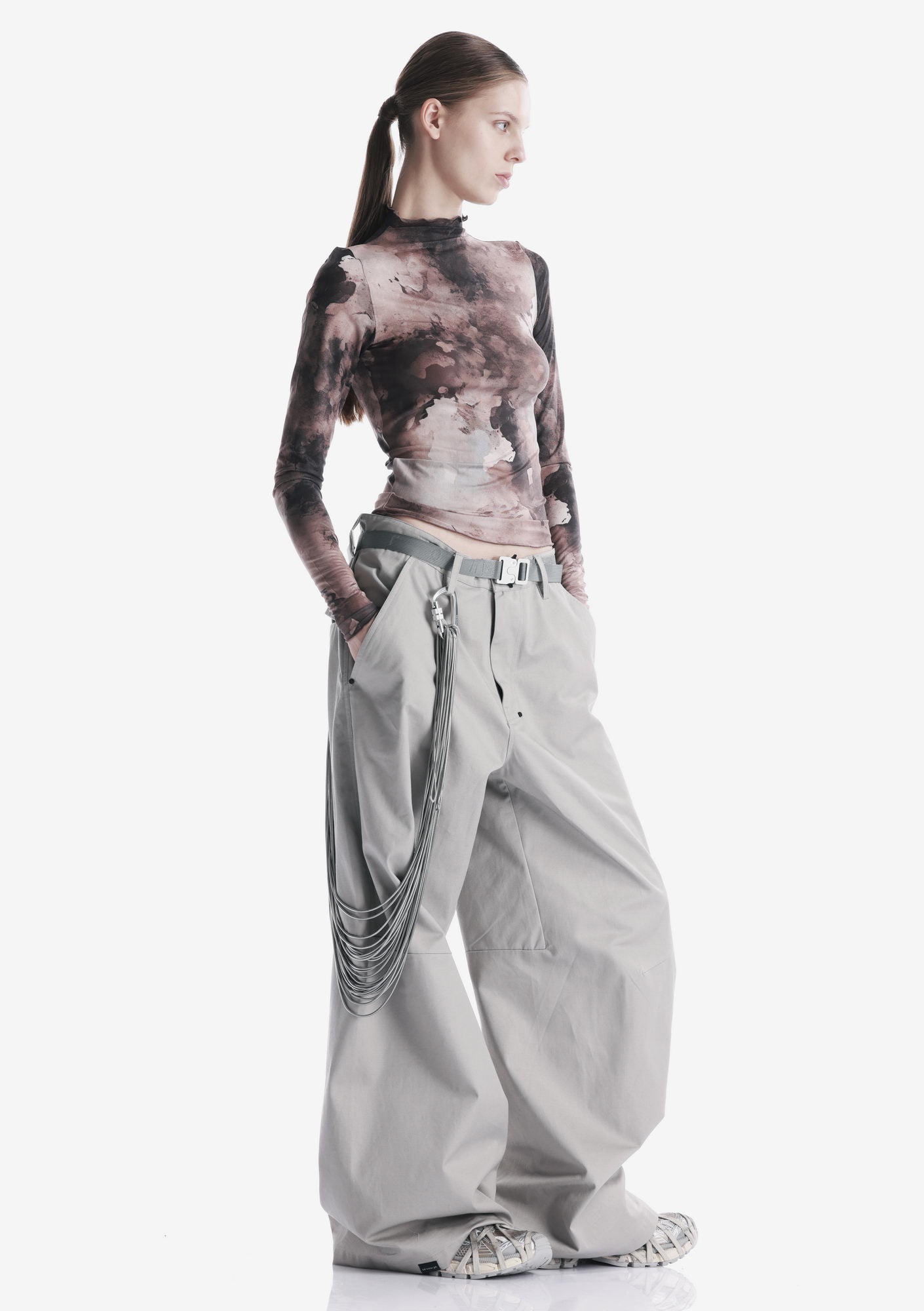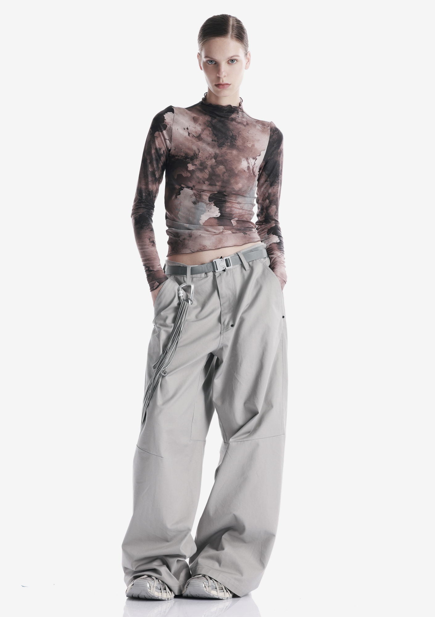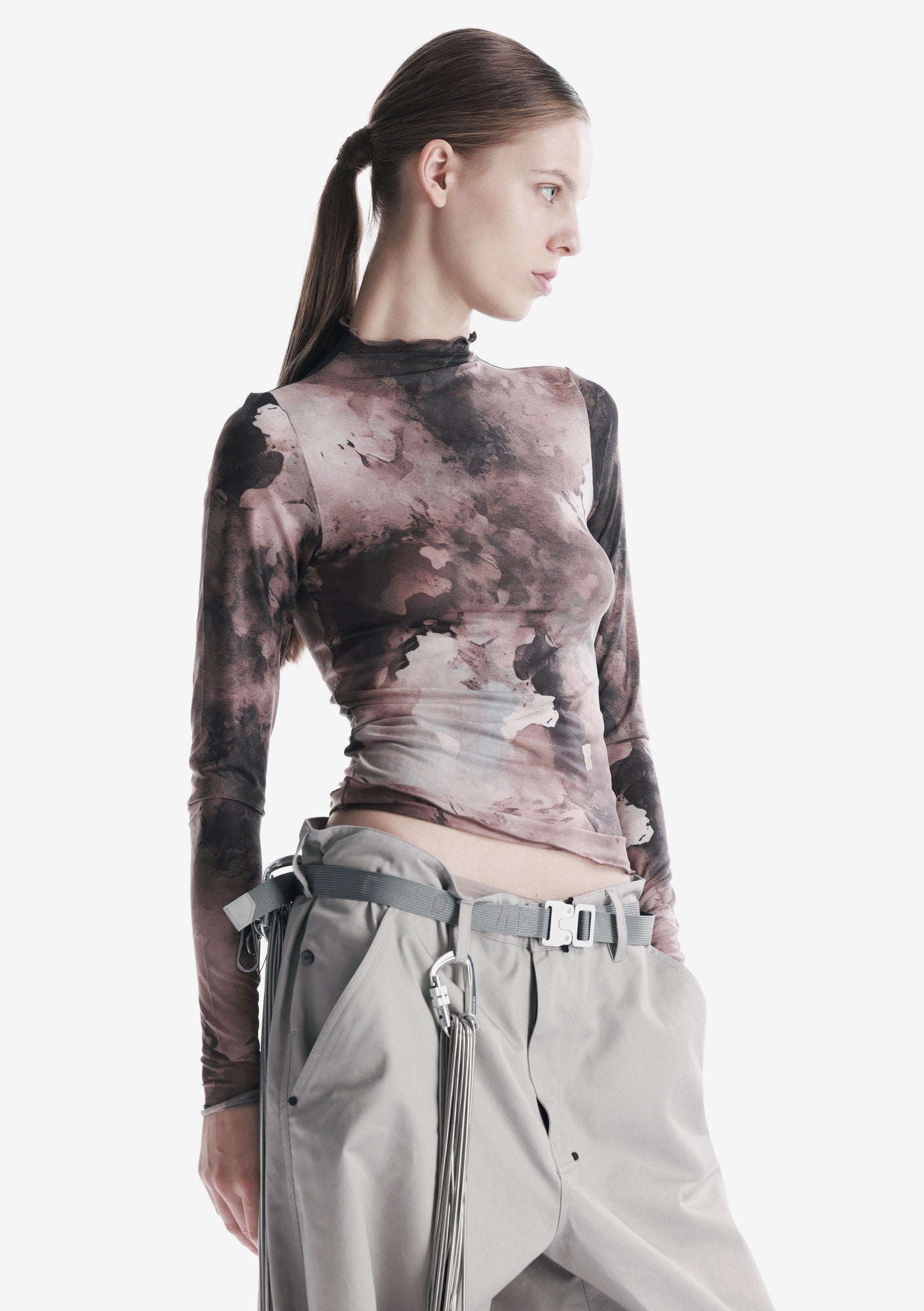 Топ GUIANA из полупрозрачного тянущегося материала с высокой горловиной. Полупрозрачная структура создаёт лаконичный, графичный образ и обеспечивает кмфорт в движении.