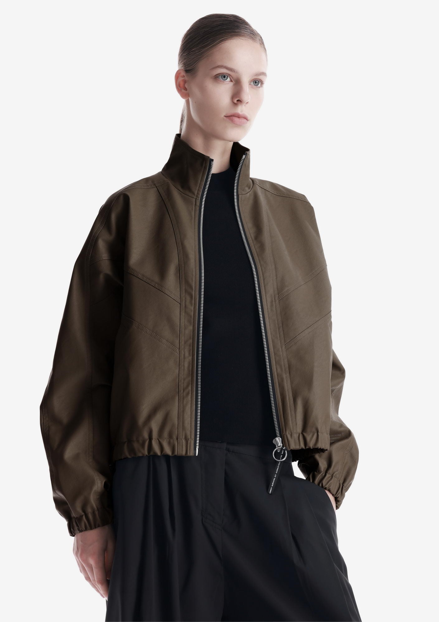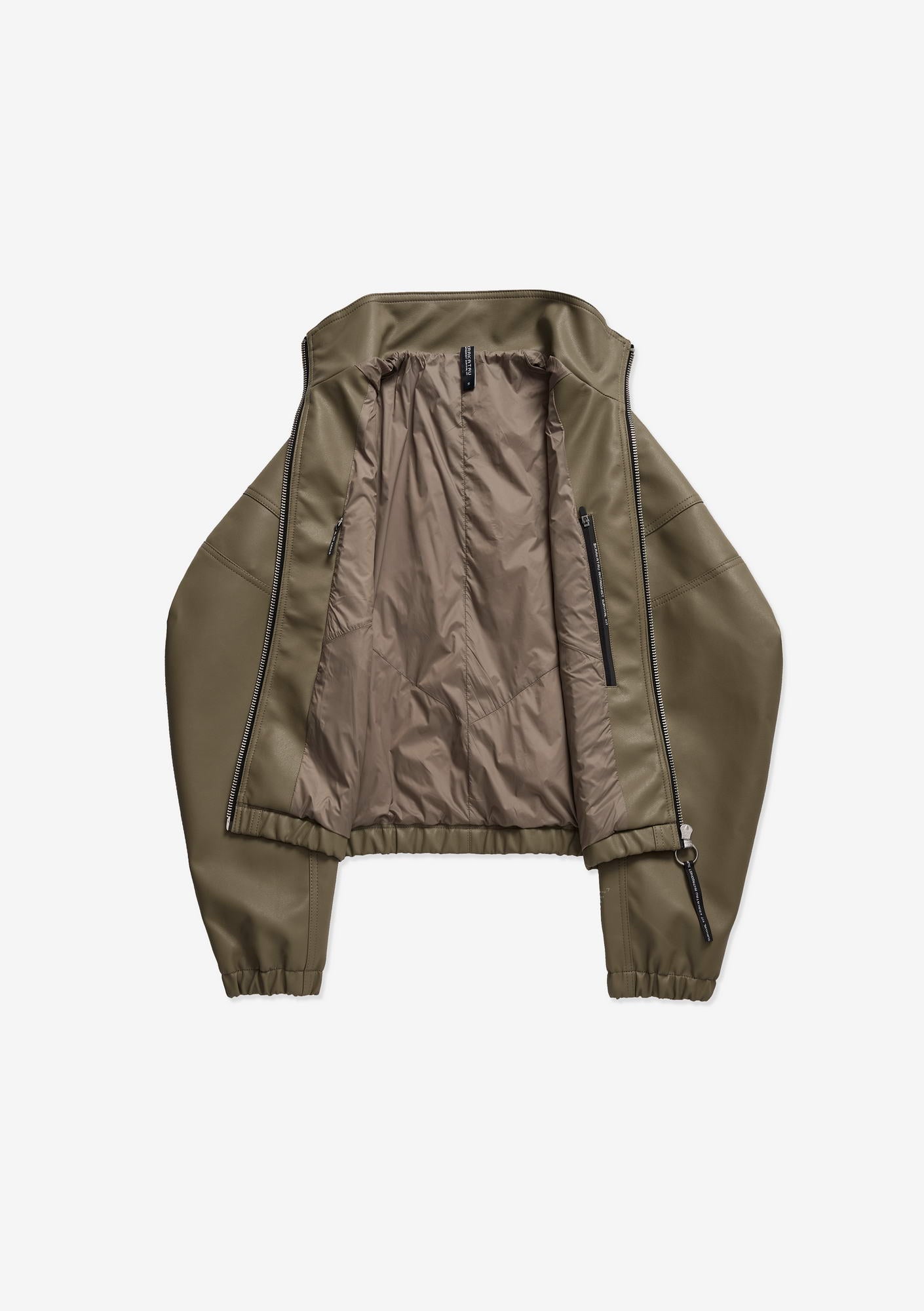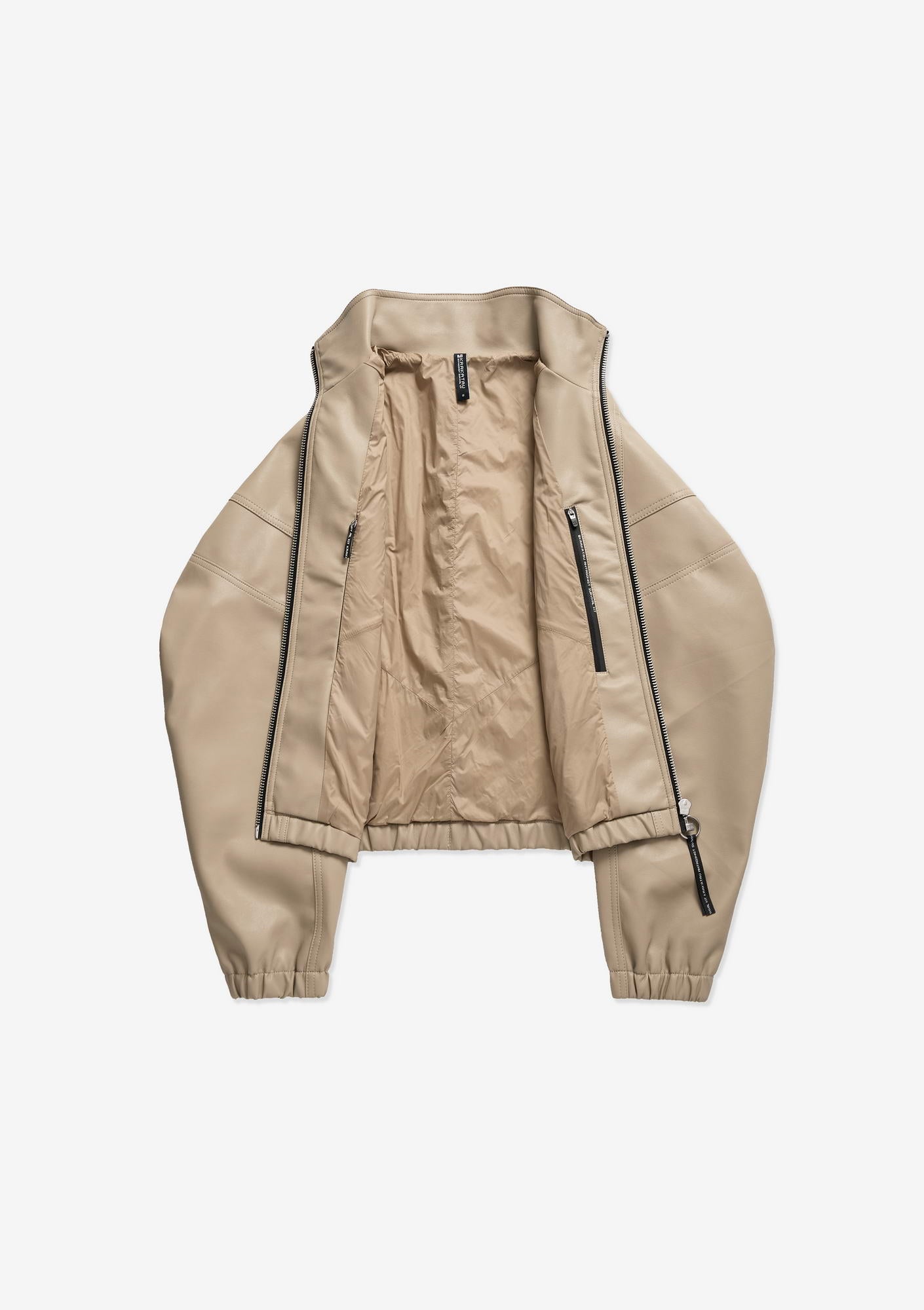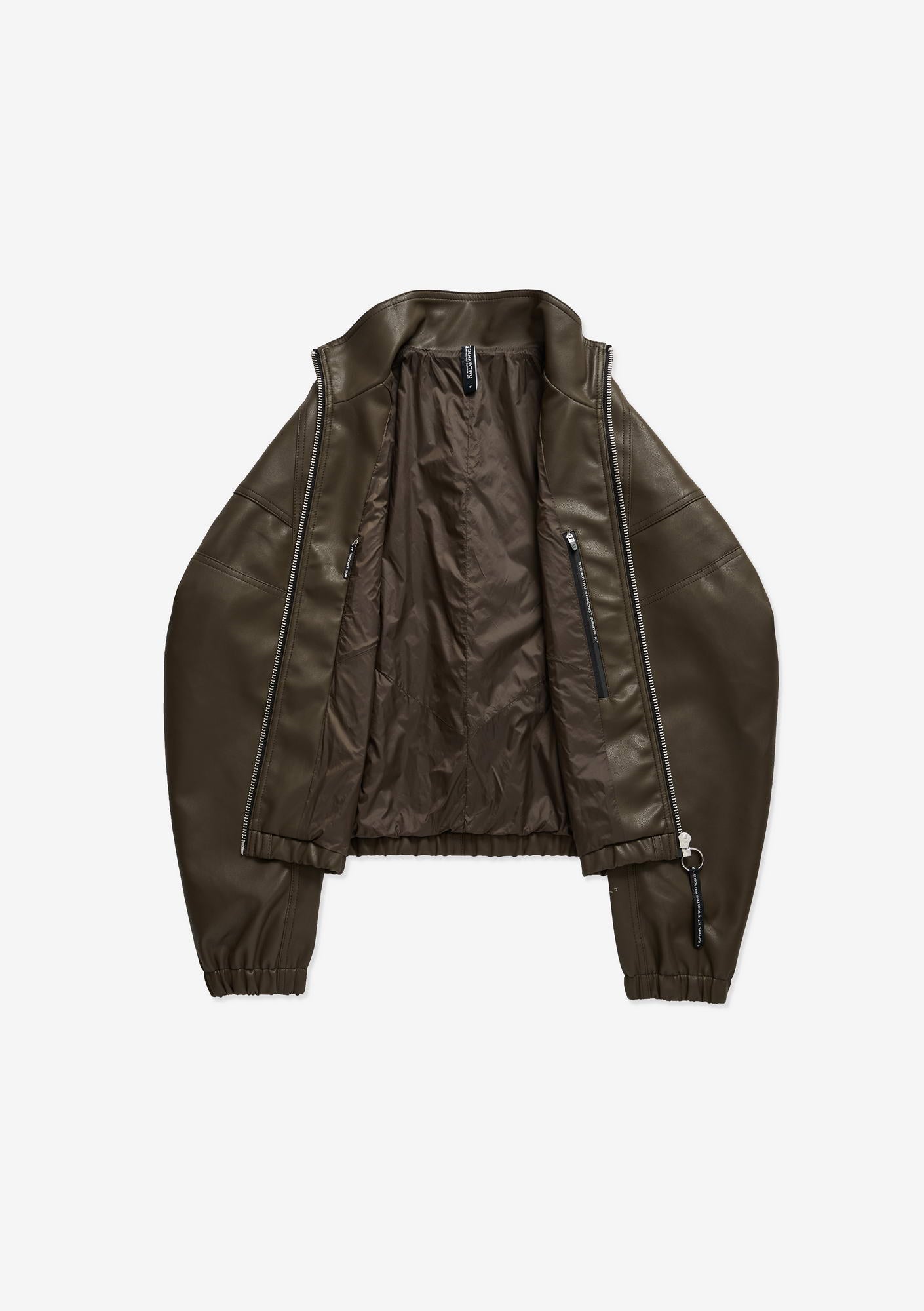 Минималистичный бомбер RUANG из эко-кожи с изогнутыми линиями кроя и структурным силуэтом. Металлическая молния и карманы для рук добавляют функциональность, а эластичные манжеты и низ отвечают за комфортную посадку.