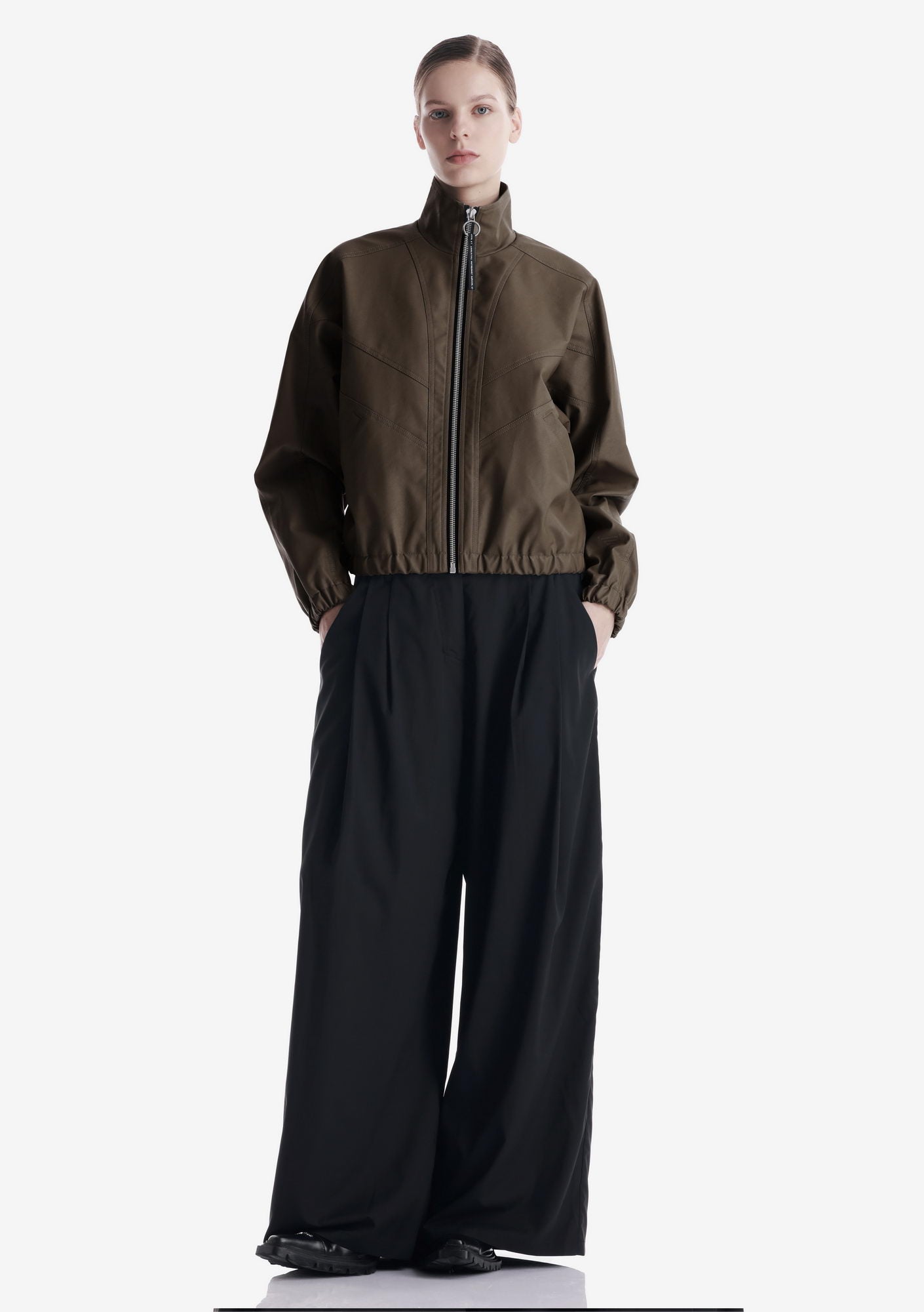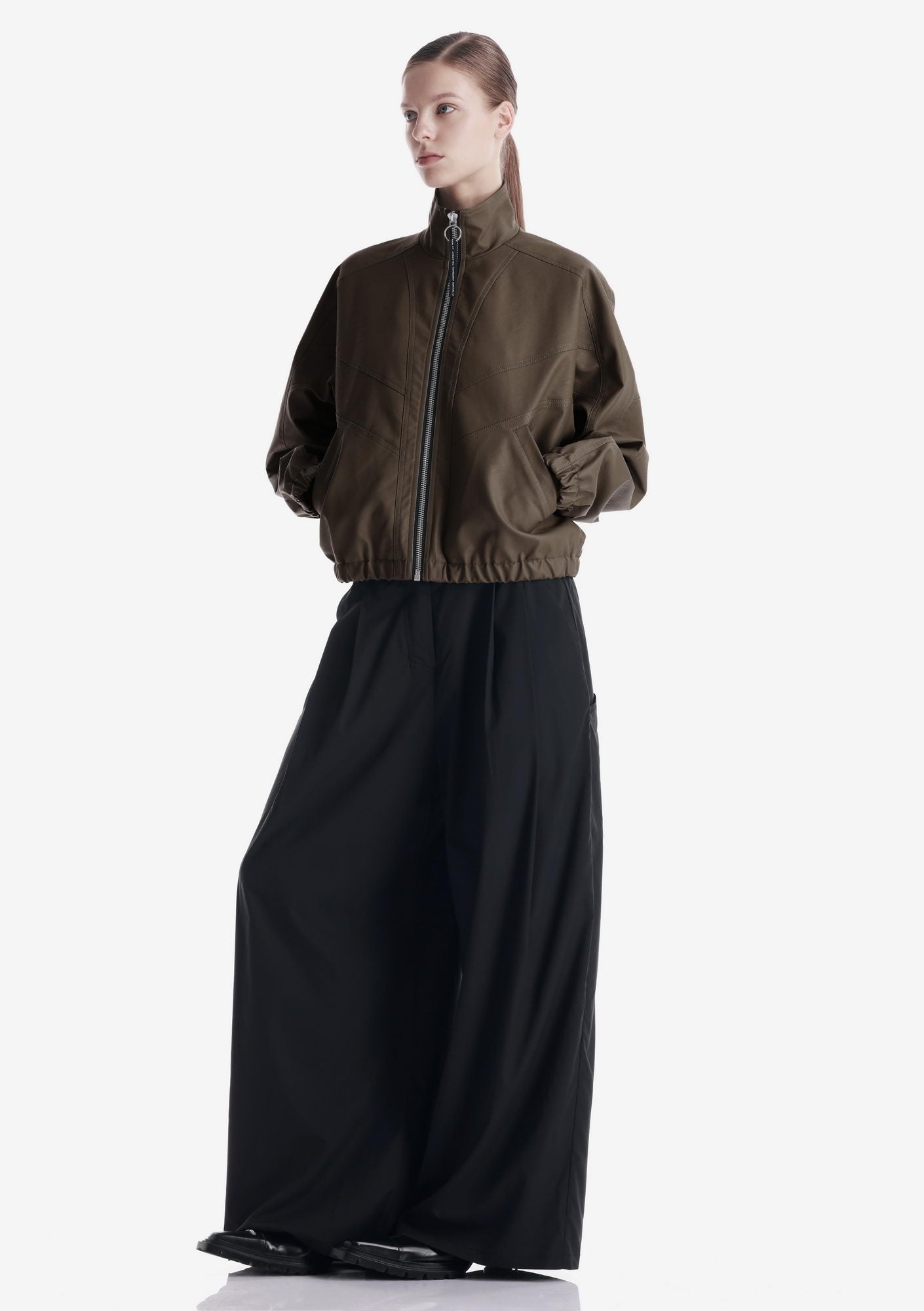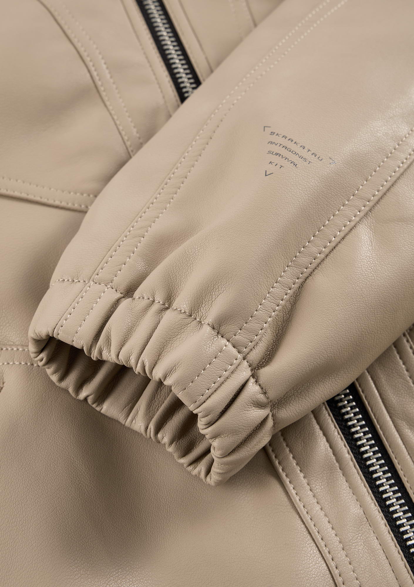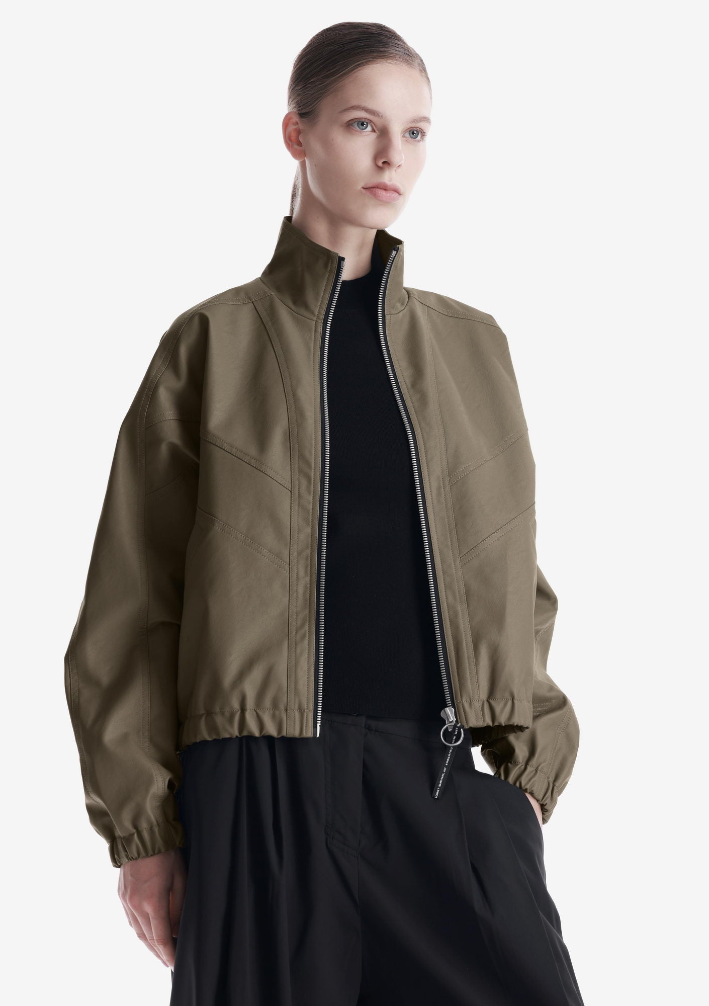 Минималистичный бомбер RUANG из эко-кожи с изогнутыми линиями кроя и структурным силуэтом. Металлическая молния и карманы для рук добавляют функциональность, а эластичные манжеты и низ отвечают за комфортную посадку.