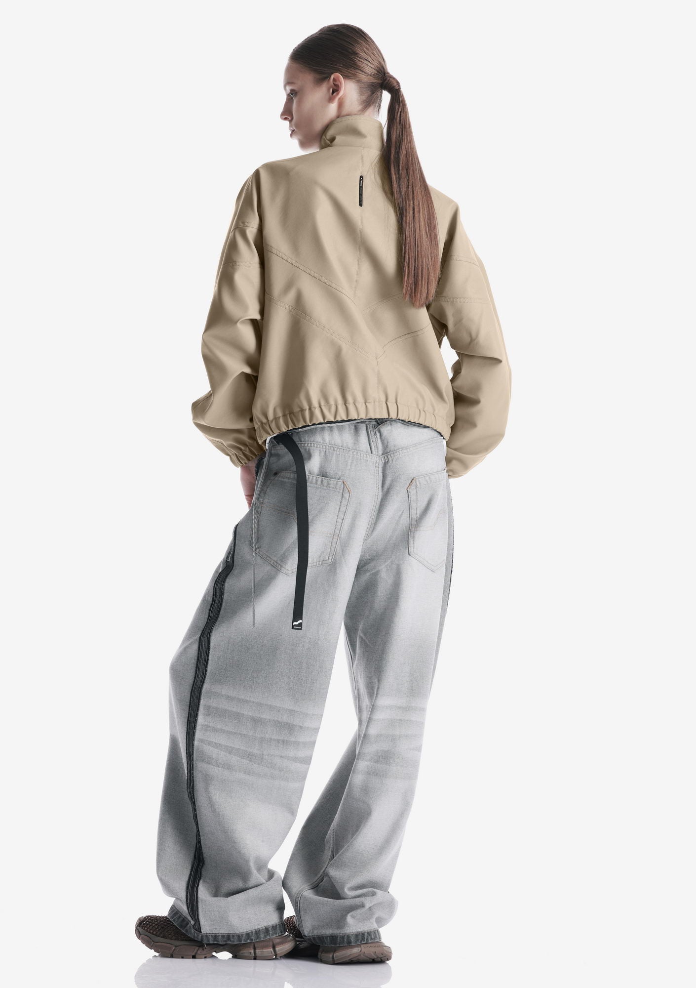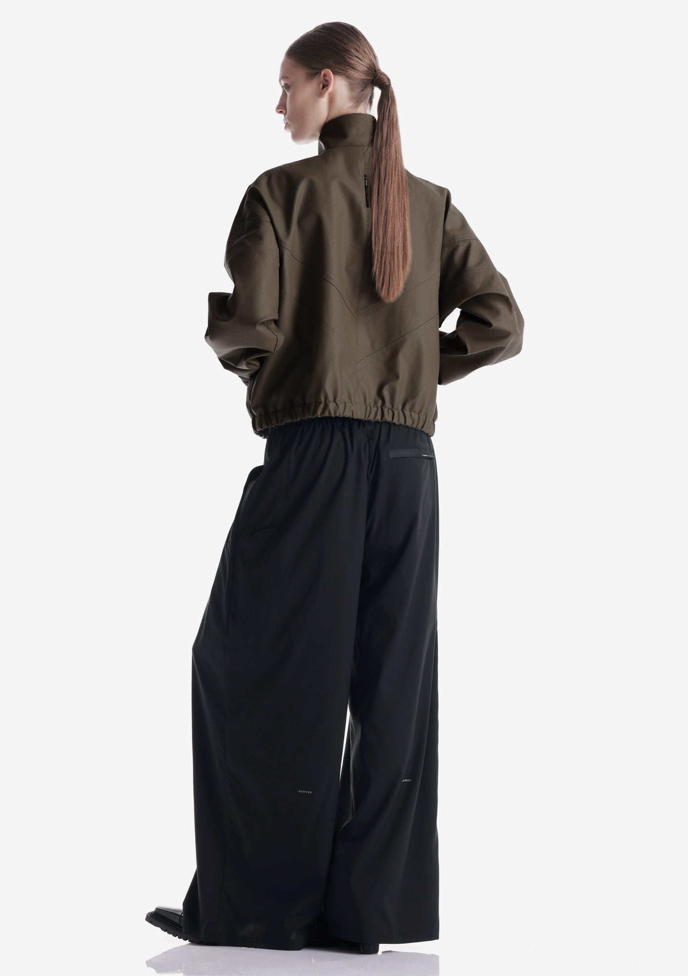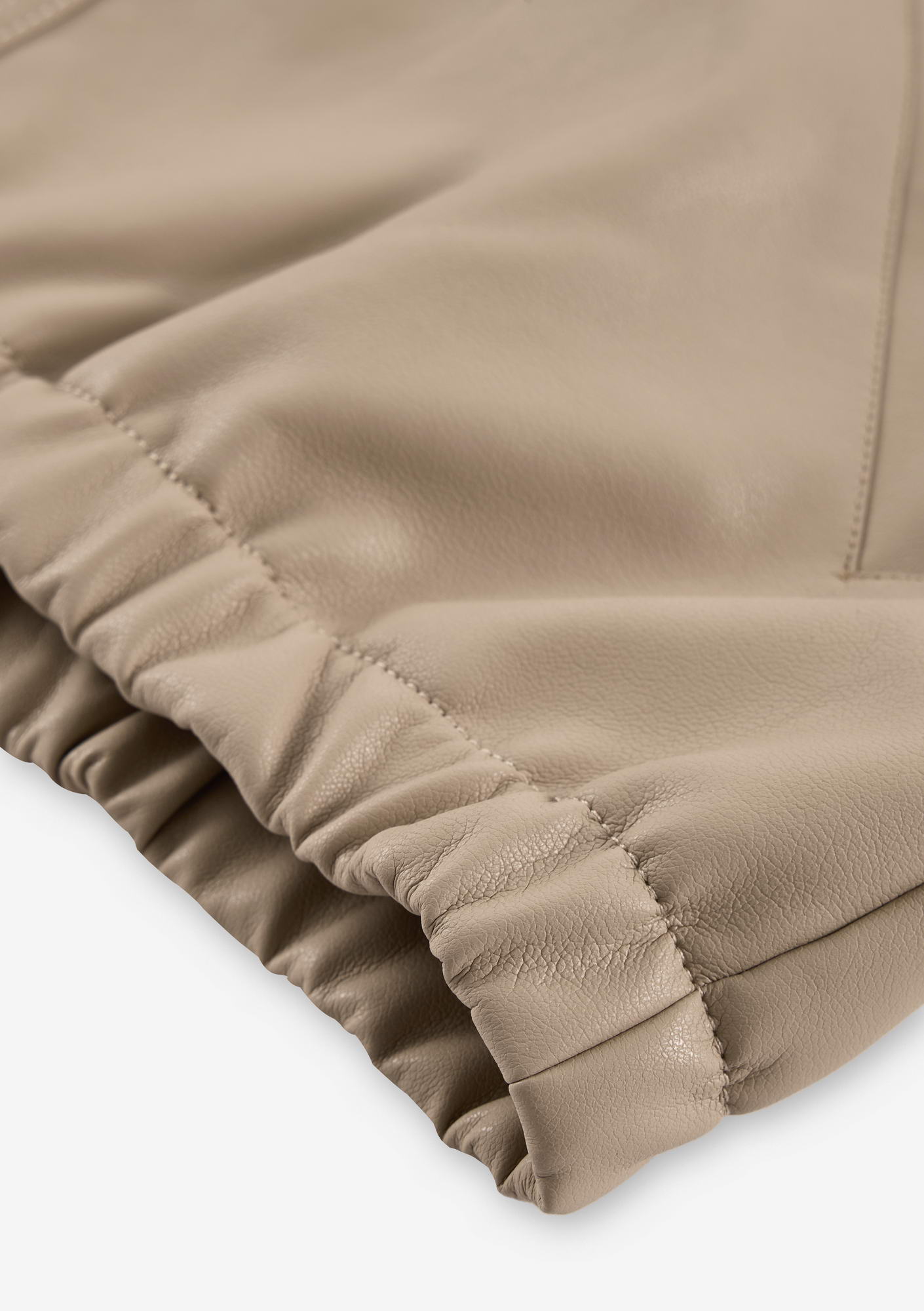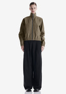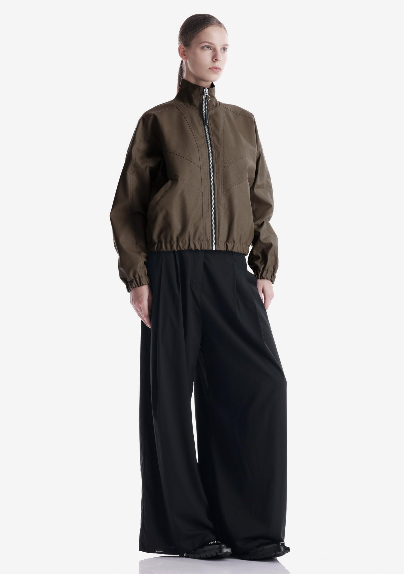 Минималистичный бомбер RUANG из эко-кожи с изогнутыми линиями кроя и структурным силуэтом. Металлическая молния и карманы для рук добавляют функциональность, а эластичные манжеты и низ отвечают за комфортную посадку.