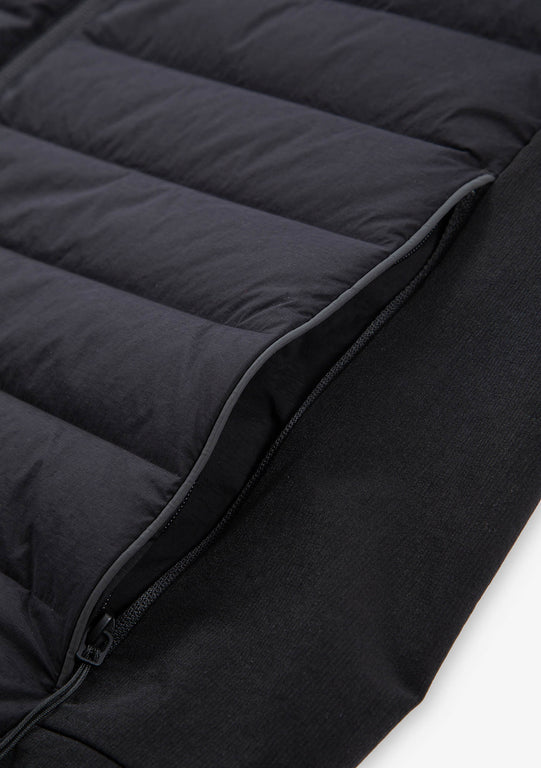 Утеплённая торсовая часть. Тонкий, мягкий на ощупь, эластичный нейлон. Обработан стойким водоотталкивающей пропиткой из экологичных ингредиентов без содержания PFC. 85 % нейлон, 15 % эластан. Утиный пух с максимальным содержанием пуха 90/10 усиливает теплозащитные качества куртки.