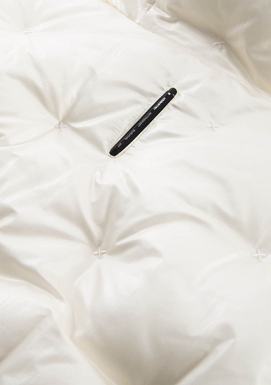 Ткань с эффектом бликов и глубины состоит из двух соединённых слоёв: полупрозрачного гладкого нейлона снаружи и переработанного полиэстера с плотной фактурой внутри. Cire-финиш удерживает пух и усиливает водоотталкивающие свойства. Покрыта стойким водоотталкивающим составом из экологичных ингредиентов без содержания PFC — не загрязняет окружающую среду и безвреден для организма человека.