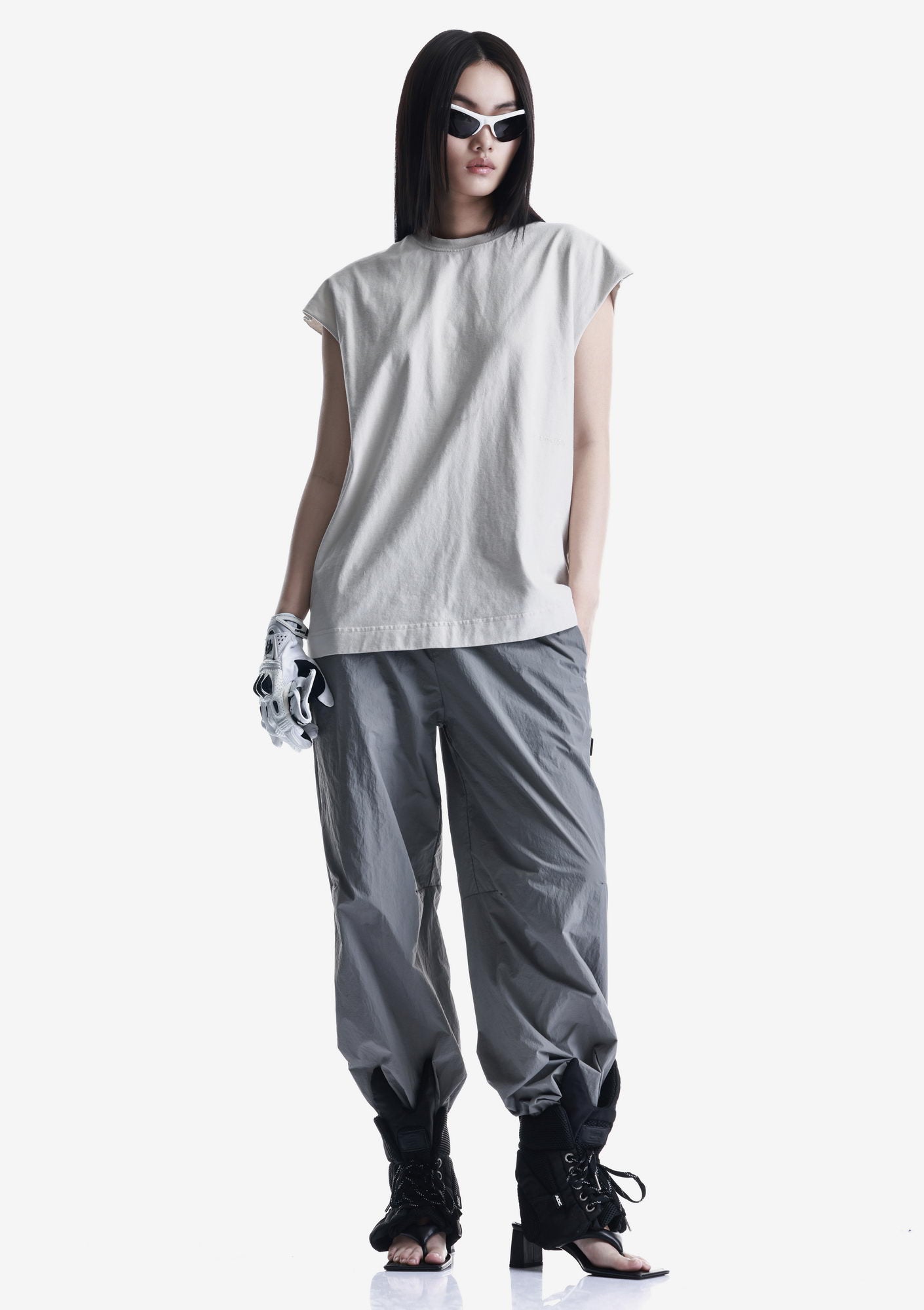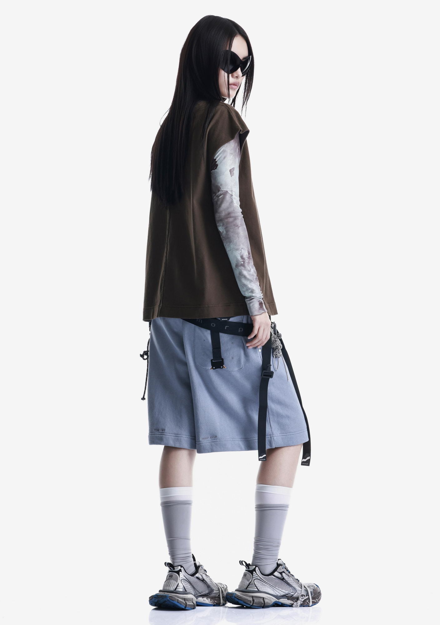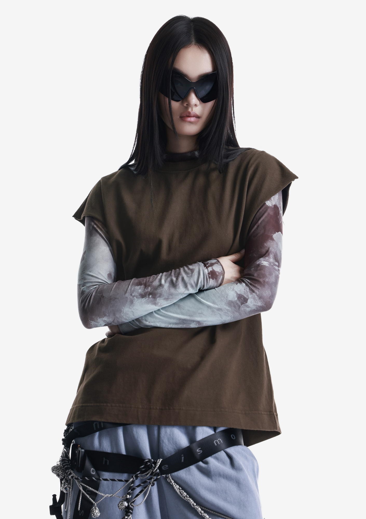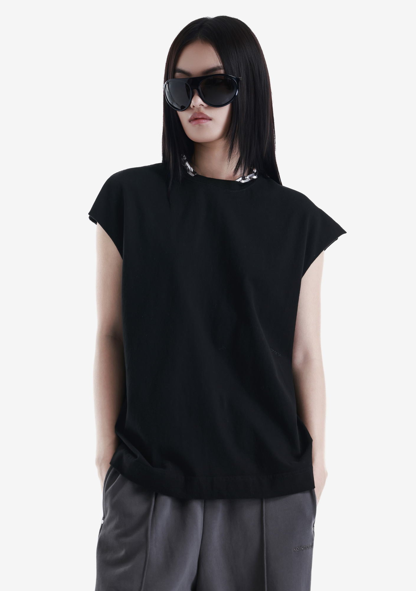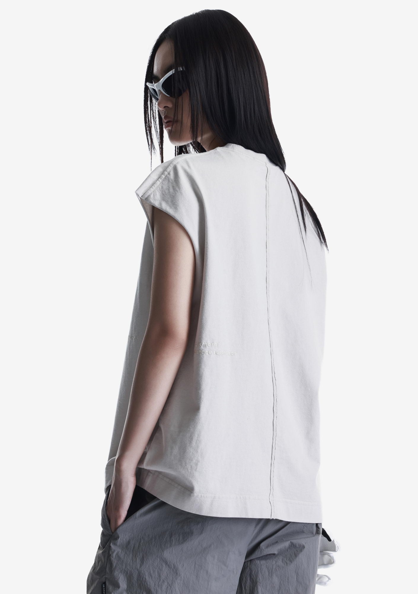 Футболка-безрукавка KHURU из мягкого хлопкового джерси с начёсом. Вышивка и открытый шов по центру спинки создают графичный акцент, необработанные проймы поддерживают свободный характер модели.