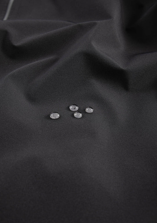 Износостойкий эластичный нейлон с матовой поверхностью устойчив к разрывам и адаптируется к движениям. Трёхслойная конструкция с мембранным покрытием TPU и водоотталкивающей пропиткой без фторуглеродов (PFC-free DWR) защищает от ветра и влаги. 85 % нейлон, 15 % спандекс.